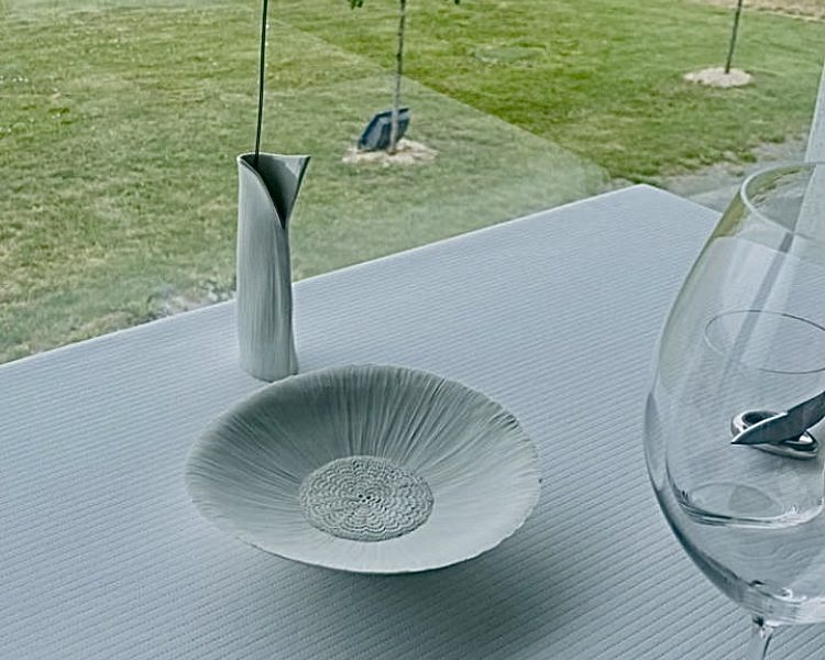 Création de coupelles florales gravées à la pointe, pièces uniques destinées à recevoir le beurre du Chef Xavier Taffart.