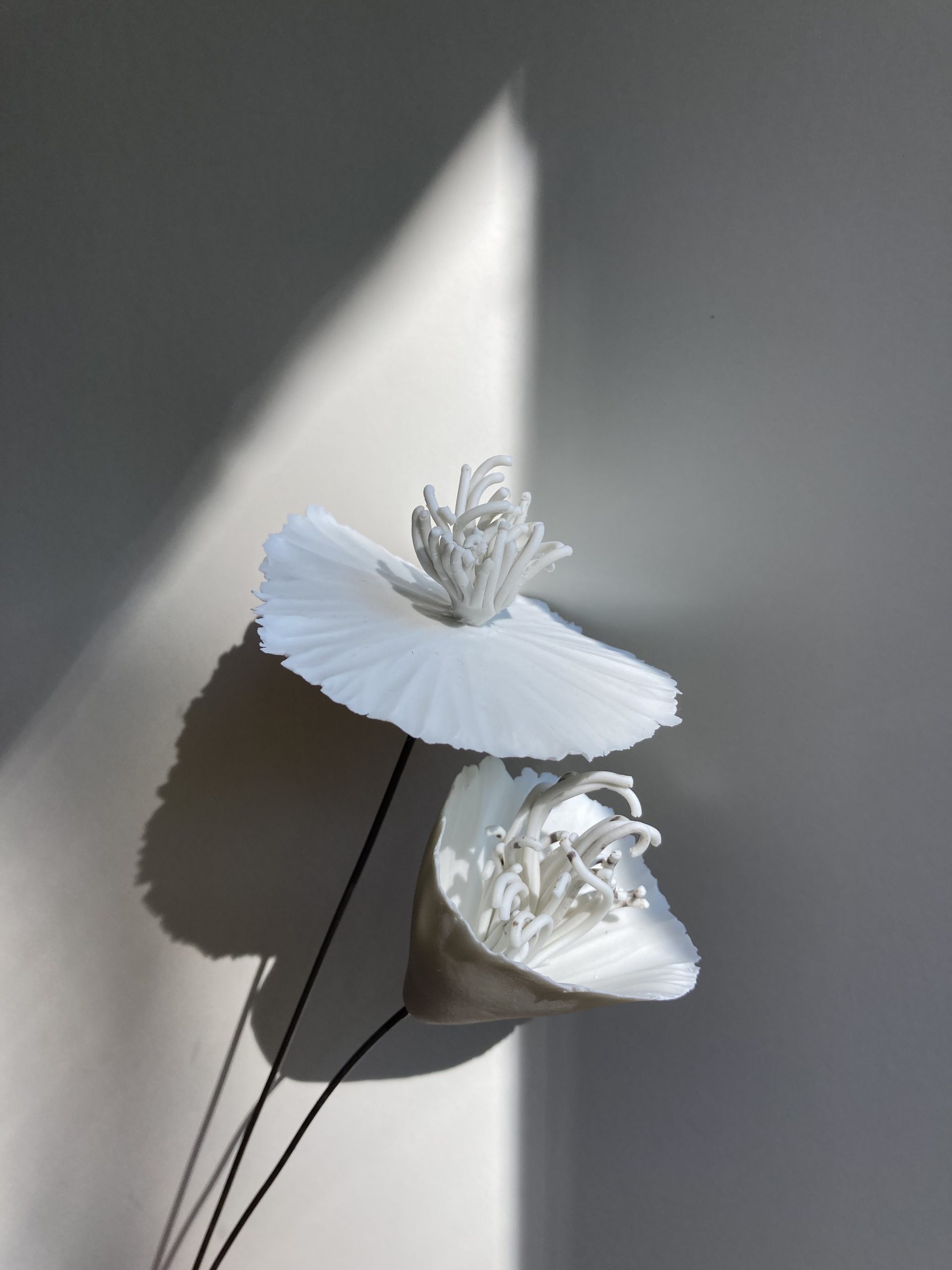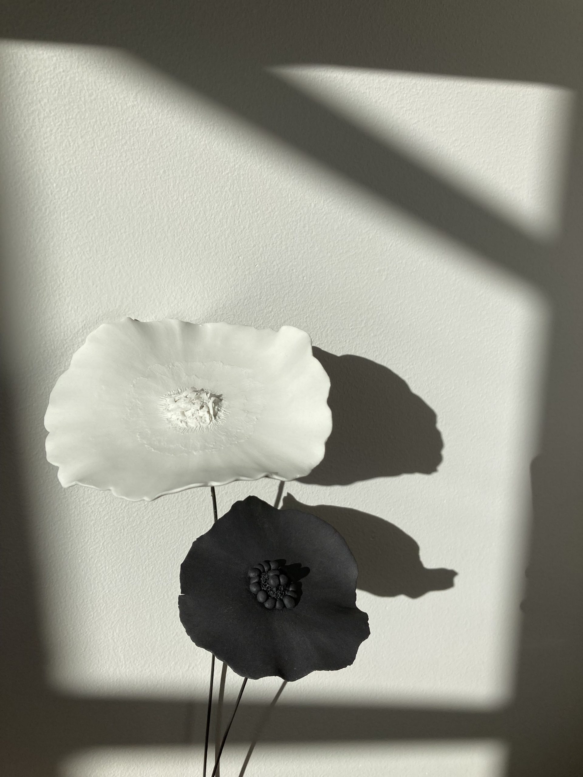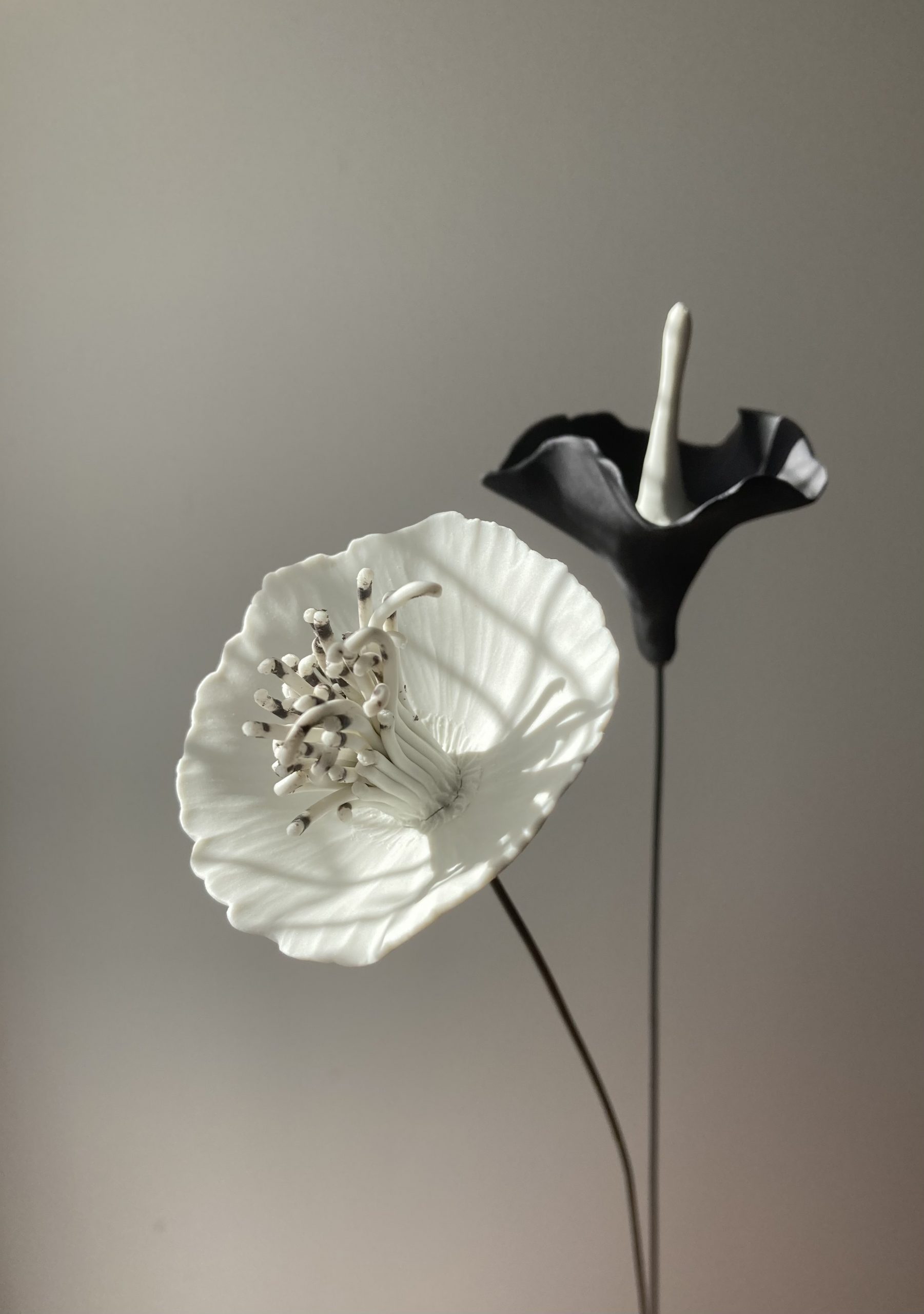Mes fleurs en porcelaine éclosent toutes d’une boule de porcelaine blanche ou noire travaillée délicatement à la main. De tailles variées, en porcelaine noire ou blanche, de forme libre, gravées, plissées, découpées, ondulées, toutes mes fleurs en porcelaine sont des pièces uniques poétiques et design.. Elles sont montées sur une tige d’acier vernie., Vous pouvez composer un bouquet intemporel de fleurs en porcelaine ou juste mettre une fleur dans un soliflore. Une décoration florale unique, délicate, épurée, sobre et originale.