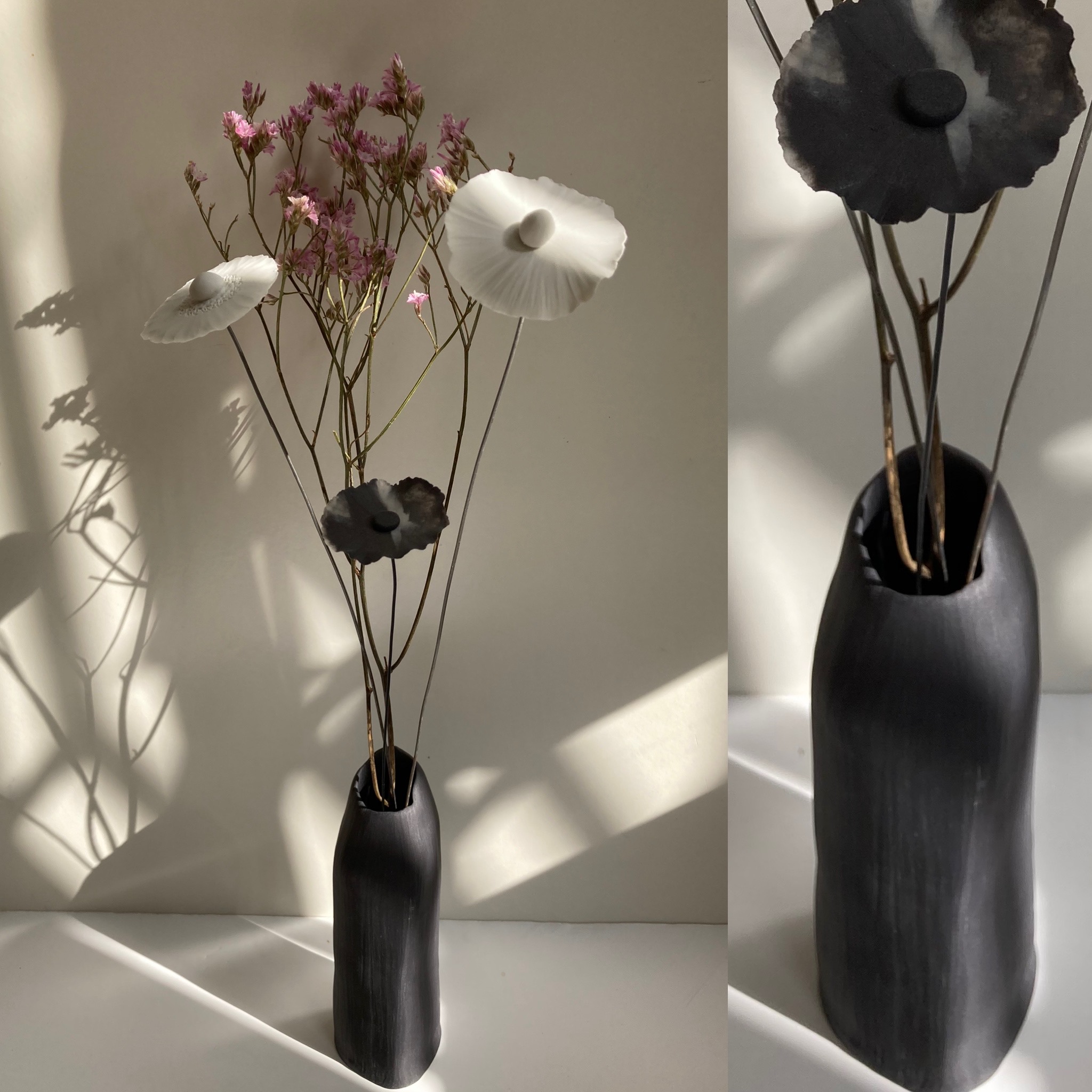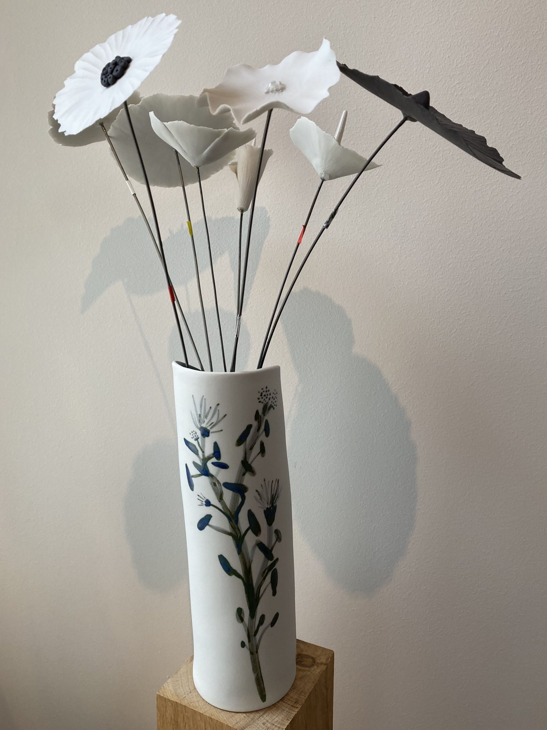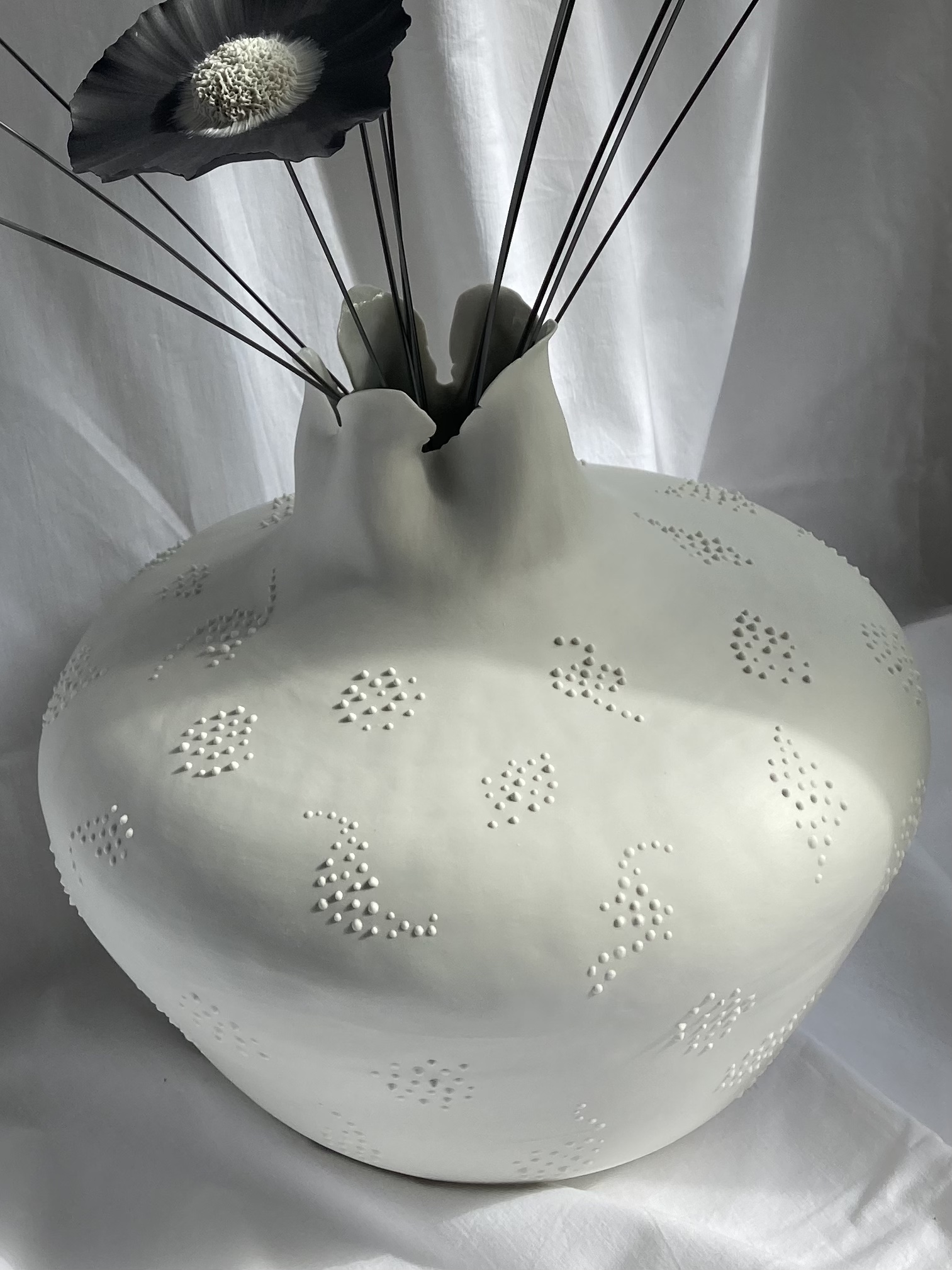 Certains de mes vases en porcelaine sont gravés à la pointe, d’autres sont structurés, polis, décorés de fleurs en porcelaine appliquées avant cuisson ou faits de porcelaine blanche et noire mêlées. Grands, petits, hauts, fins, ronds, mes vases en porcelaine sont tous des créations différentes pour accueillir tout type de fleurs naturelles ou bien sûr mes fleurs en porcelaine. Vides, mes vases en porcelaine  décorent vos étagères en apportant une touche originale, délicate et unique.