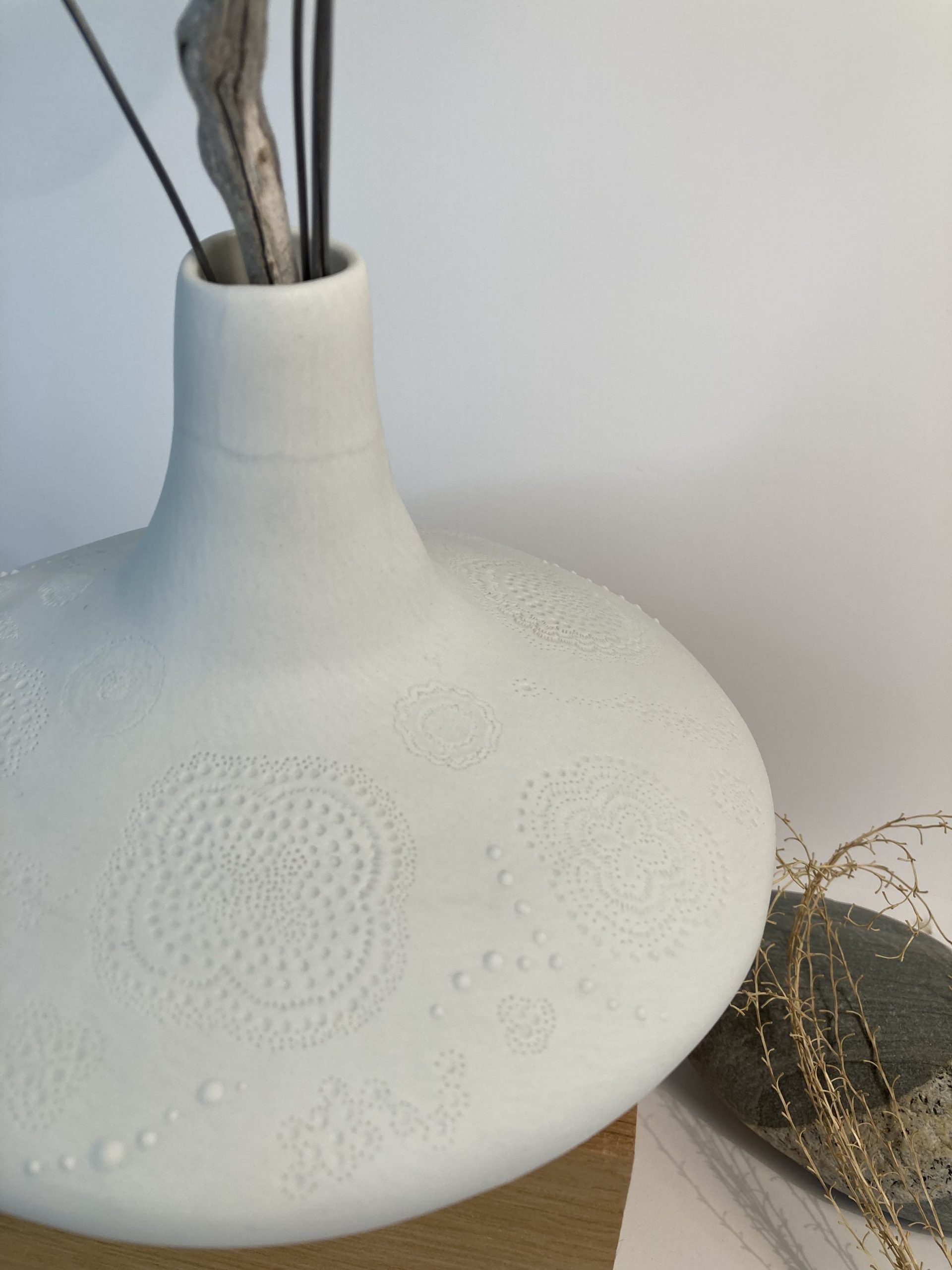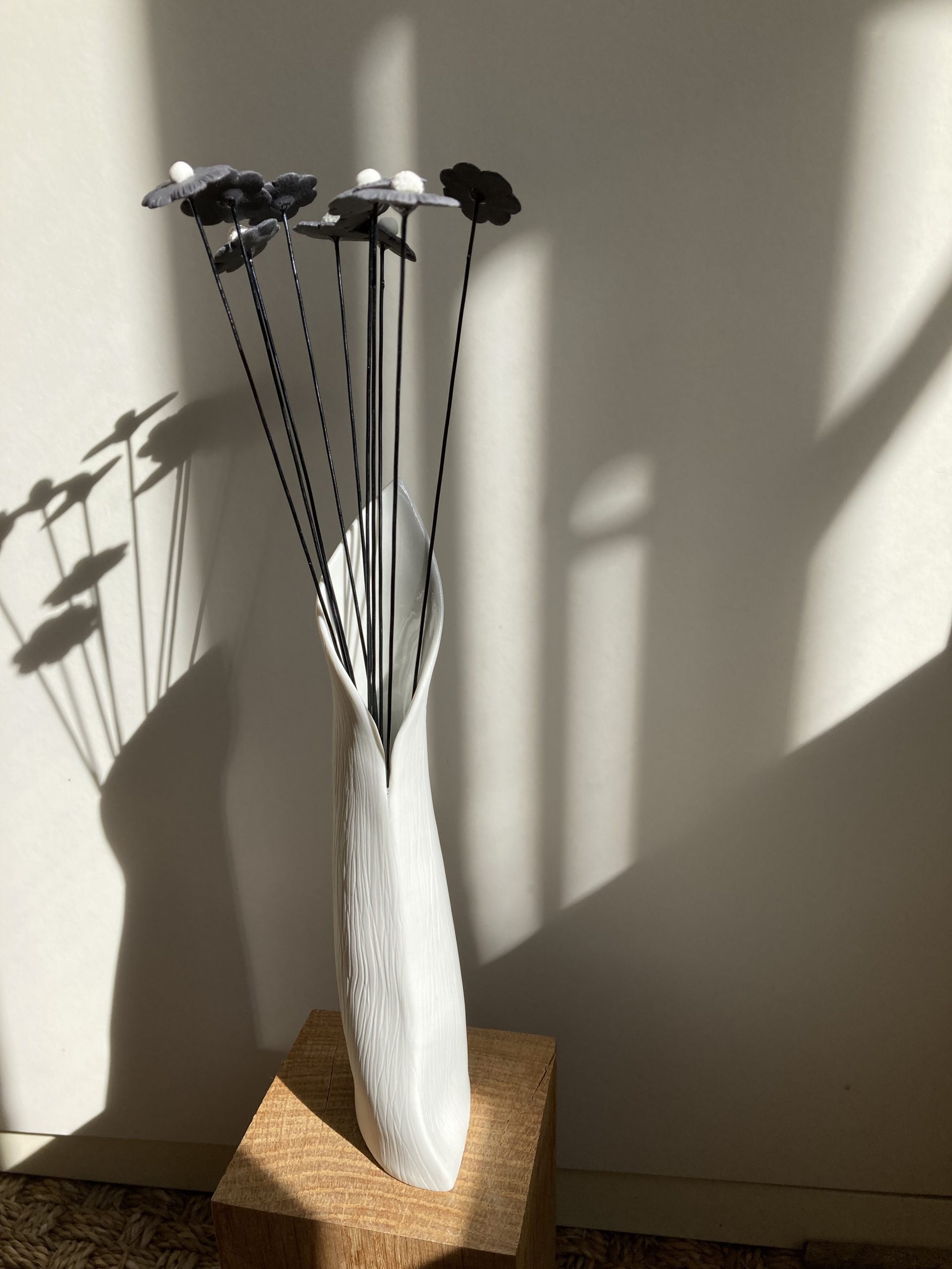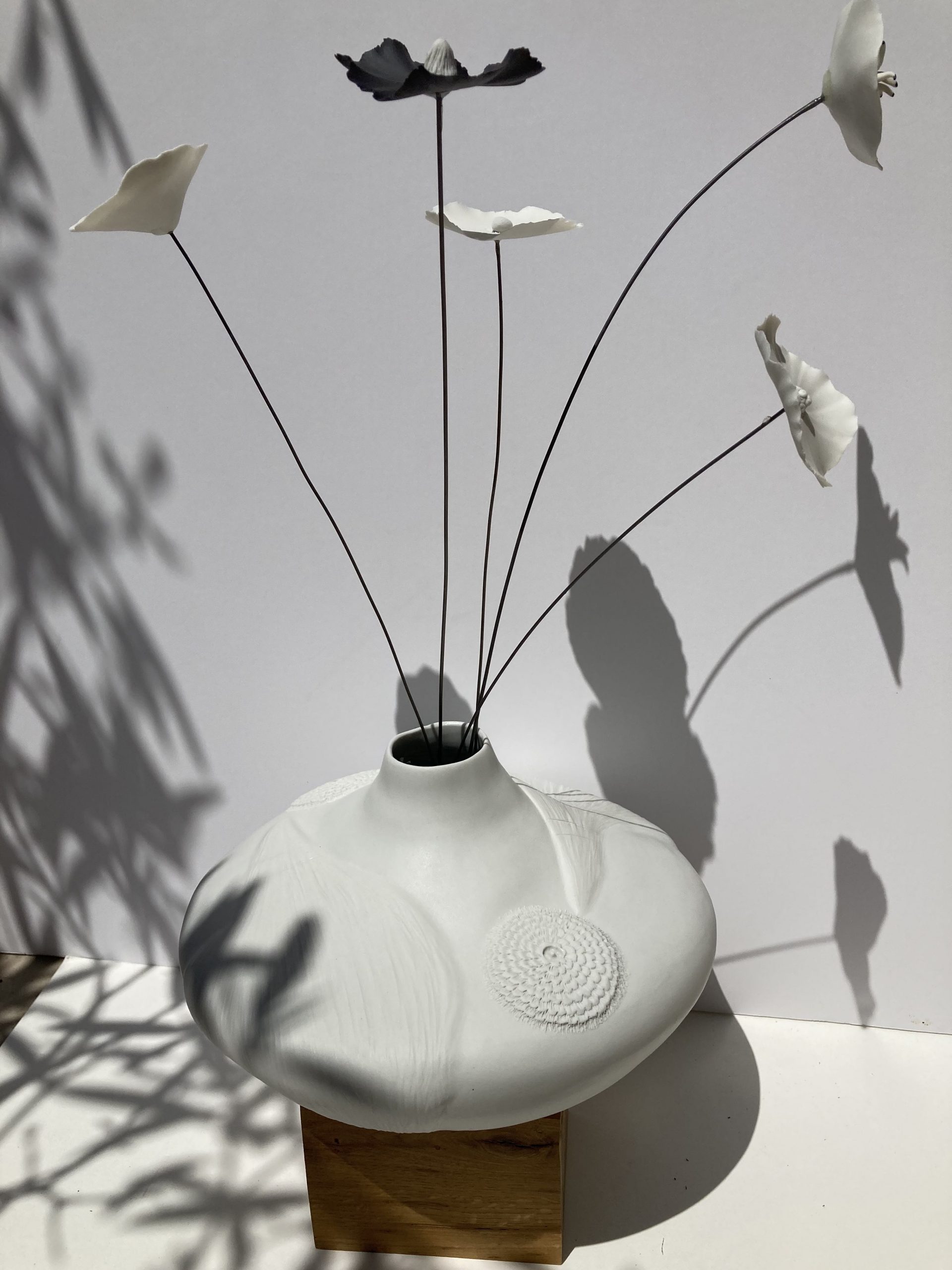 Certains de mes vases en porcelaine sont gravés à la pointe, d’autres sont structurés, polis, décorés de fleurs en porcelaine appliquées avant cuisson ou faits de porcelaine blanche et noire mêlées. Grands, petits, hauts, fins, ronds, mes vases en porcelaine sont tous des créations différentes pour accueillir tout type de fleurs naturelles ou bien sûr mes fleurs en porcelaine. Vides, mes vases en porcelaine décorent vos étagères en apportant une touche originale, délicate et unique.