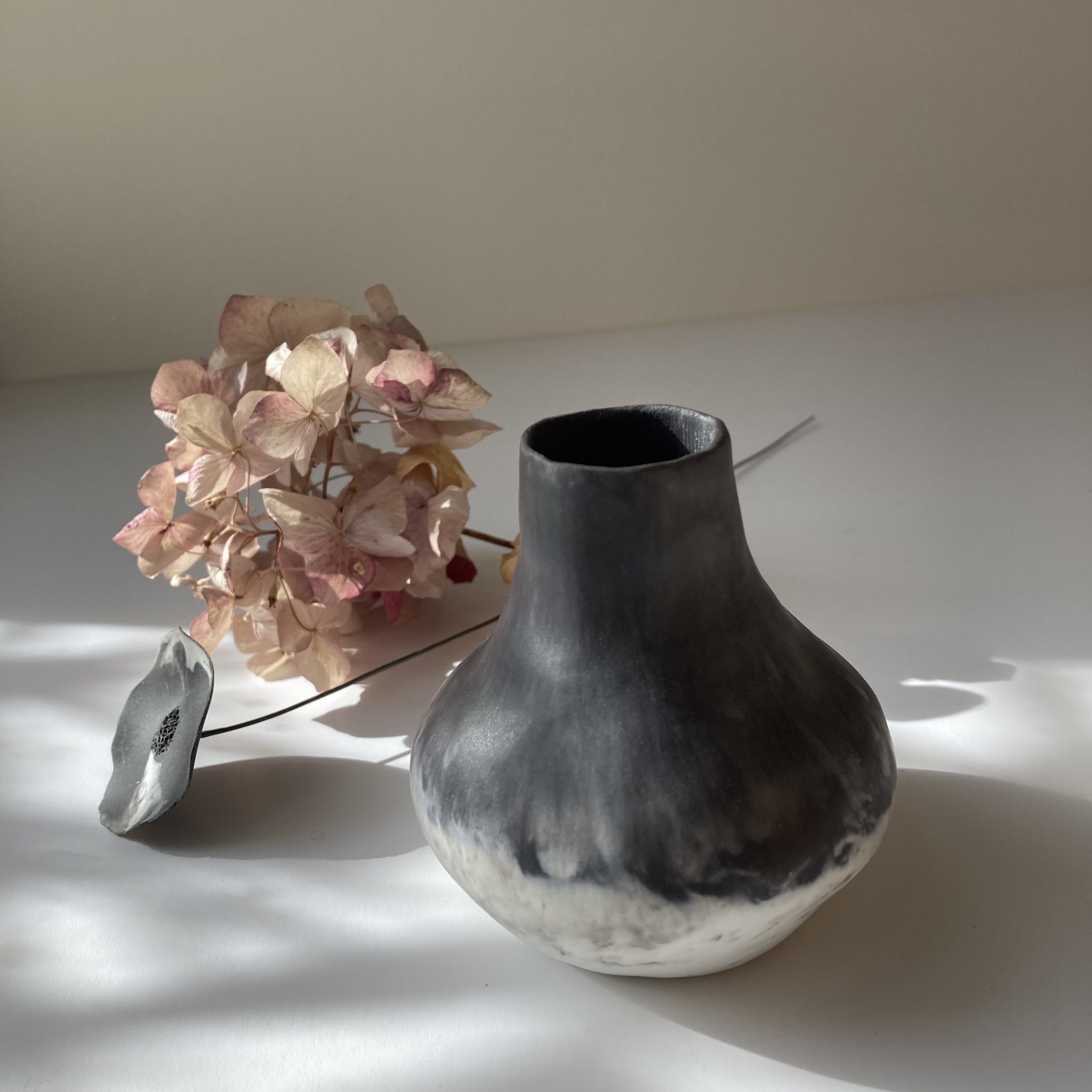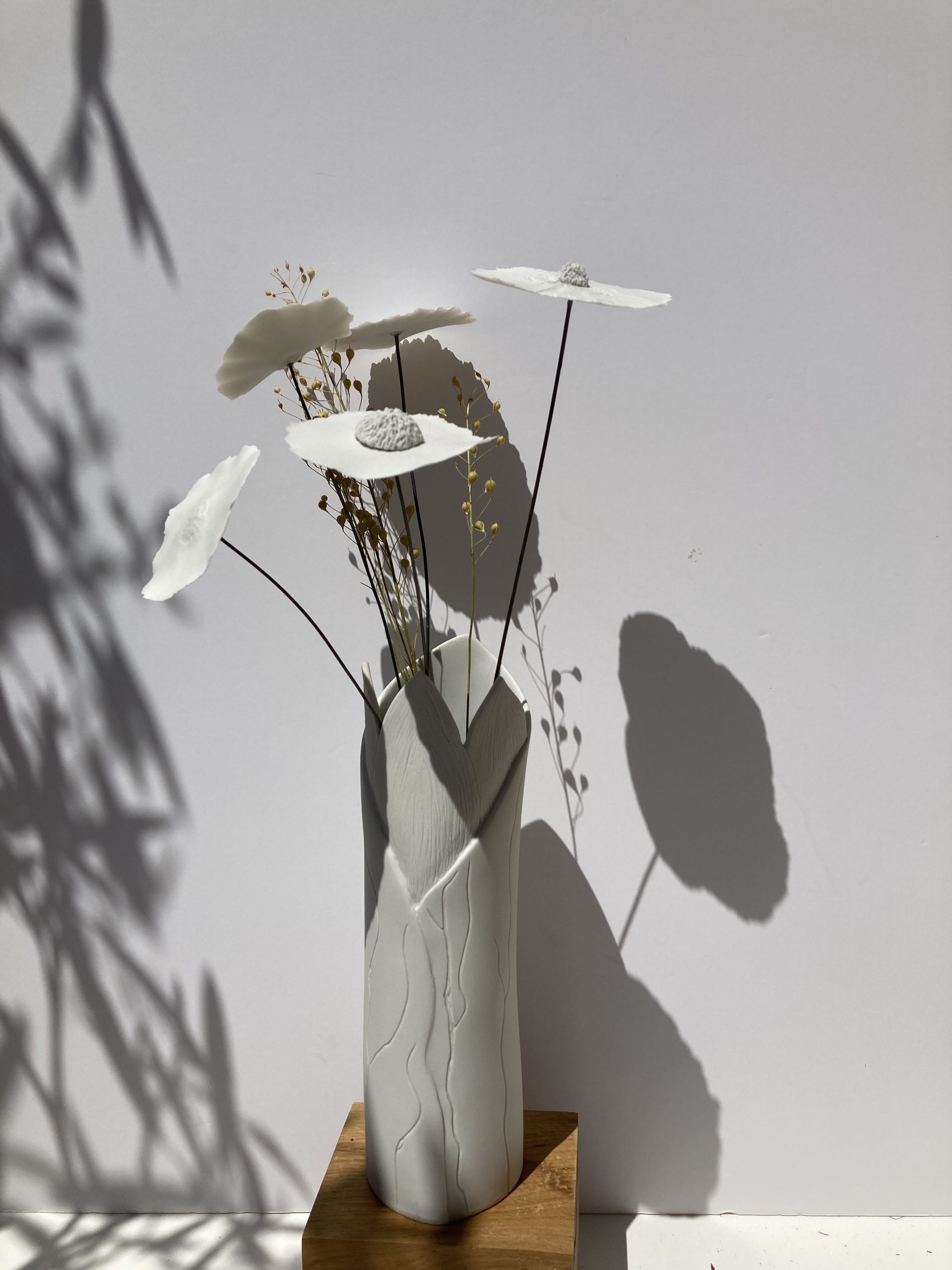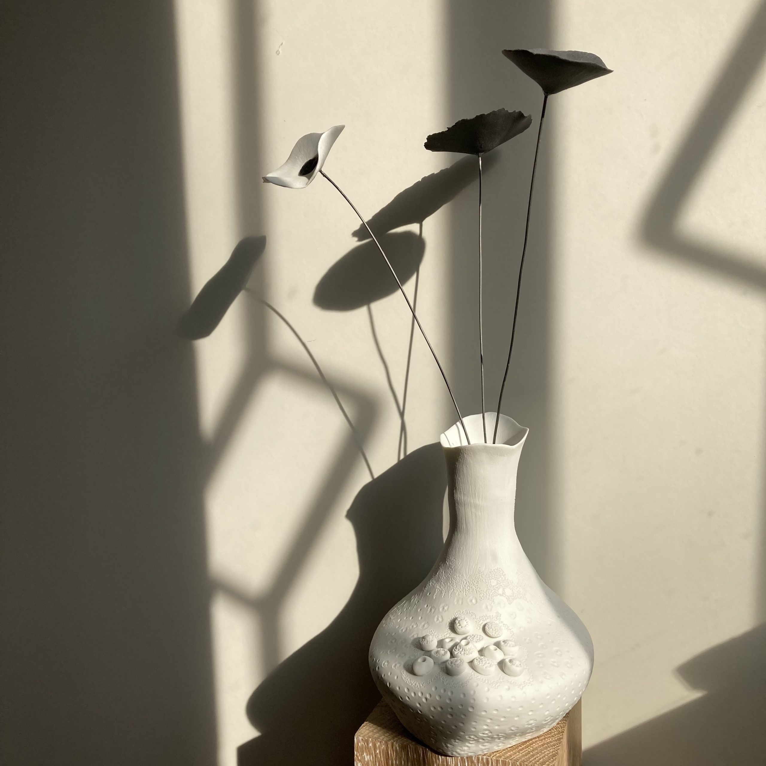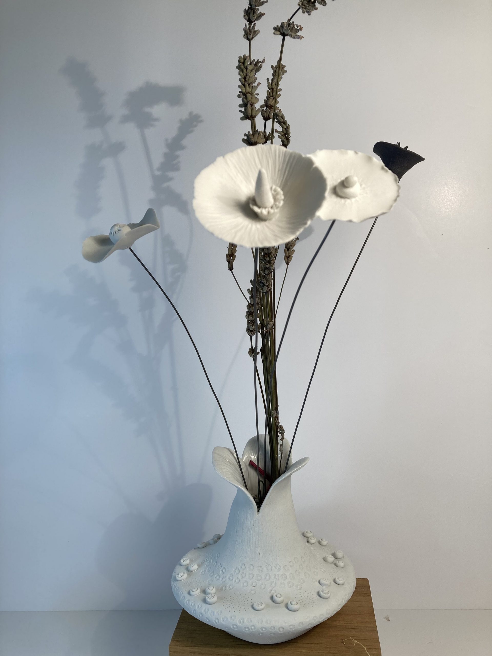 Certains de mes vases en porcelaine sont gravés à la pointe, d’autres sont structurés, polis, décorés de fleurs en porcelaine appliquées avant cuisson ou faits de porcelaine blanche et noire mêlées. Grands, petits, hauts, fins, ronds, mes vases en porcelaine sont tous des créations différentes pour accueillir tout type de fleurs naturelles ou bien sûr mes fleurs en porcelaine. Vides, mes vases en porcelaine décorent vos étagères en apportant une touche originale, délicate et unique.
